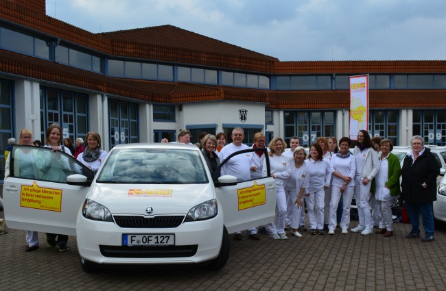 Alle Fahrzeuge - weiß mit der roten Aufschrift auf gelben Grund „Ich pflege Menschen in ihrer vertrauten Umgebung“ - wurden am 26. März 2014 auf dem Gelände der Feuerwehr Karben Mitte offiziell an die Mitarbeiter des Ambulanten Pflegedienstes übergeben. 12 der 27 Fahrzeuge gingen direkt nach Offenbach. Ganz unbekannt ist das Fahrzeug dem ASB nicht, so rollt einer bereits seit dem Sommer 2013 beim Pflegedienst in Offenbach, wo er die Erwartungen der Pflegekräfte erfüllte. „Wir sind mit diesem Typ sehr auf die Wünsche unserer Mitarbeiter eingegangen“, sagte Ulrich Müller. Teilbare Rückbank, elektrisch verstellbare Spiegel, Zentralverriegelung, Servolenkung, heizbare Vordersitze und eine Klimaanlage sind in dieser Klasse nicht üblich, konnten aber dem Team ermöglicht werden. Das Pflegepersonal ist schließlich zwischen 50.000 und 80.000 Kilometer jährlich damit unterwegs.
