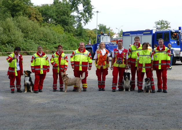 „Das Team der Rettungshundestaffel Mittelhessen" von links nach rechts: Sigrun Schleenbecker mit Taro, Jessica Schäfer, Petra Gerstner mit Enzo, Jörn Hassels, Nicole Ulrich, Alexander Strombach mit Jones, Tobias Müller, Silvia Geiger mit Kayo, Thomas Fleischmann